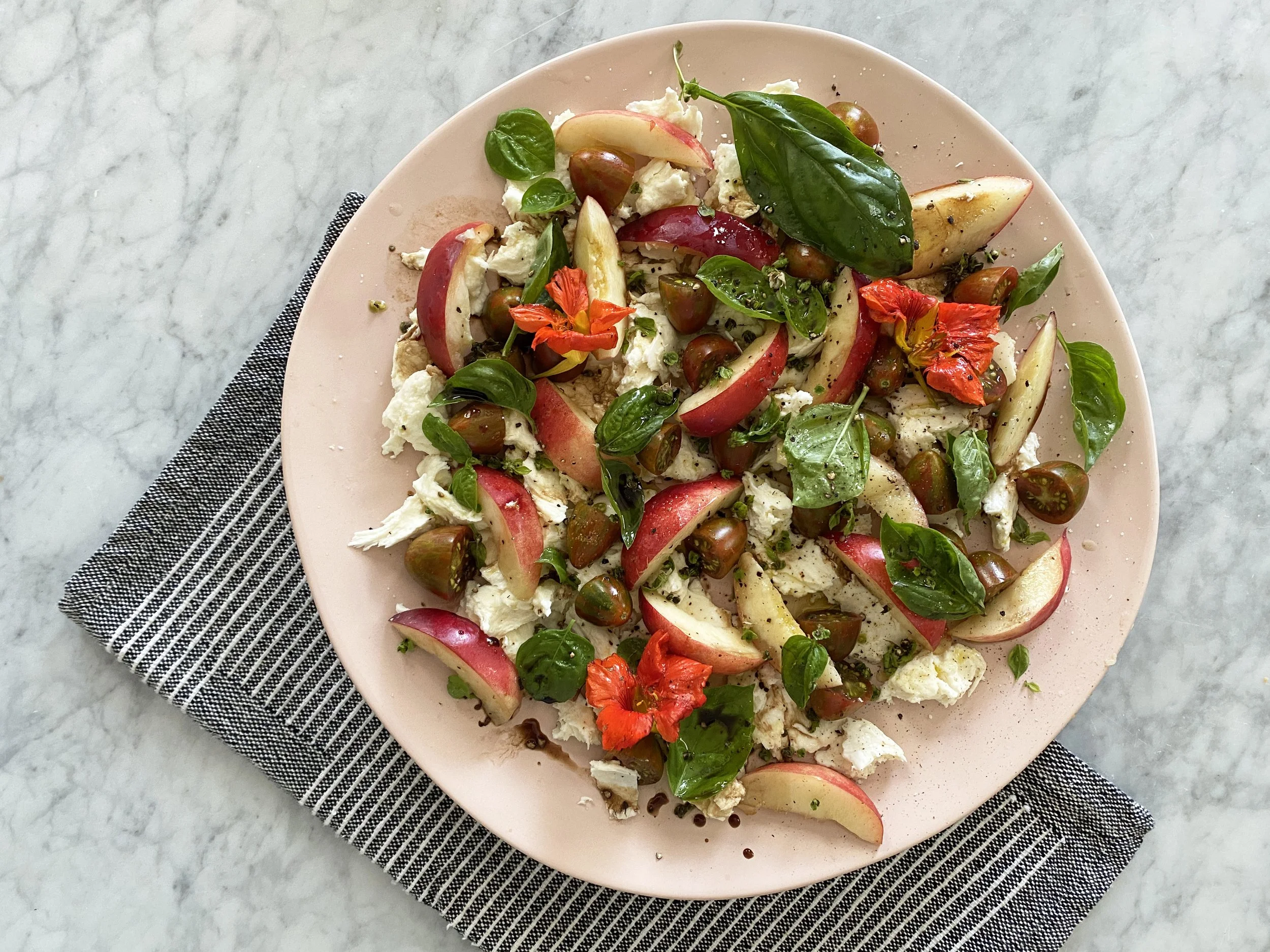 This simple spin on an already perfect Caprese salad has become our go-to summer lunch. The sweetness of the nectarines and peaches with the earthiness of the tomatoes and creaminess of the mozzarella is just so good. This recipe is so easy anyone can make it.